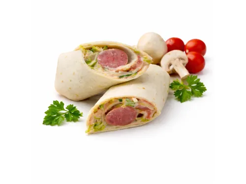 Пшеничная тортилья с копчёной курицей, сочными помидорами, хрустящим салатом и пикантным чеддером. Фирменный соус для сэндвича добавляет пикантности — идеальный перекус для активных дней!