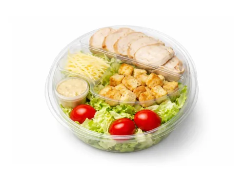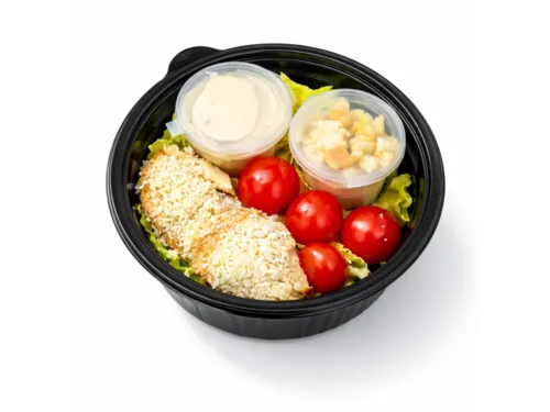 Традиционный, знаменитый и всеми любимый Салат Цезарь. Из свежих листьев салата, сладких помидорок черри, запеченного куриного филе, пармезана и гренков, заправленный нашим фирменным соусом цезарь, который не содержит лактозы, глютена и сахара! Салат очень сытный, но при этом низкокаллорийный! Добавьте соус к салату, накройте контейнер крышкой и осторожно взболтайте, чтобы все ингредиенты хорошо перемешались.