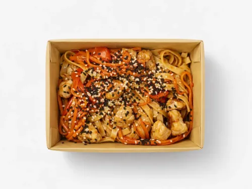 Куриное филе в соусе терияки, болгарский перец, лук, чеснок, морковь,соевый соус, лапша удон.