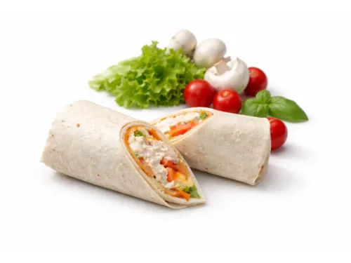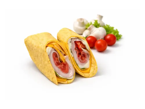 Пшеничная тортилья с копчёной курицей, сочными помидорами, хрустящим салатом и пикантным чеддером. Фирменный соус для сэндвича добавляет пикантности — идеальный перекус для активных дней!