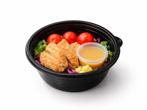 Свежий микс салата «Аликанте», сочные помидоры черри, нежные куриные стрипсы под ароматным медово‑горчичным соусом.