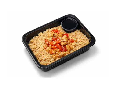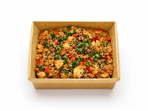 Рис, куриное филе, яйцо куриное, перец болгарский, кетчуп томатный, кимчи соус, масло подсолнечное, соевый соус, спайси соус.