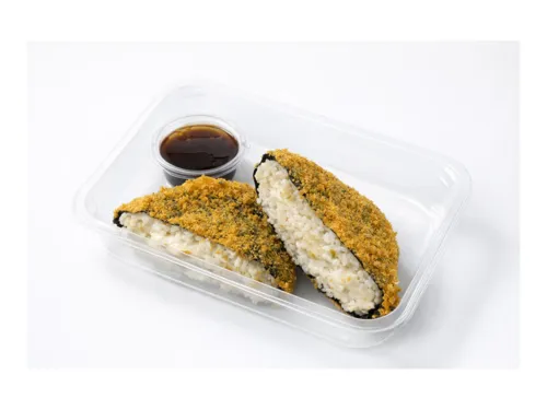 Рис, куриная копченая гудка, плавленный сыр, соус терияки, мицукан, подсолнечное масло, яйцо куриное, панировочные сухари, мука пшеничная, соль, нори.
